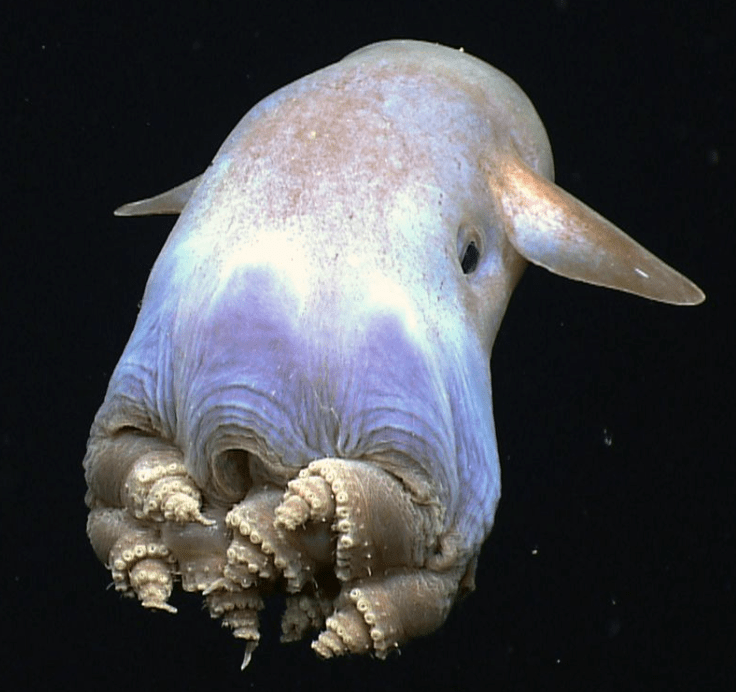 There are about 17 species of Dumbo octopus that belong to a group called “umbrella octopus,” because they are able to float with an umbrella-like look to their mantle. Read more about these adorable cephalopods at Aquarium of the Pacific.